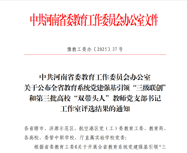 近日,省委教育工委印发《关于公布全省教育系统党建强基引领“三级联创”和第三批高校“双带头人”教师党支部书记工作室评选结果的通知》(豫教工委办〔2025〕37号),sunbet党总支成功获评“全省高校党建工作标杆院系”培育创建单位。