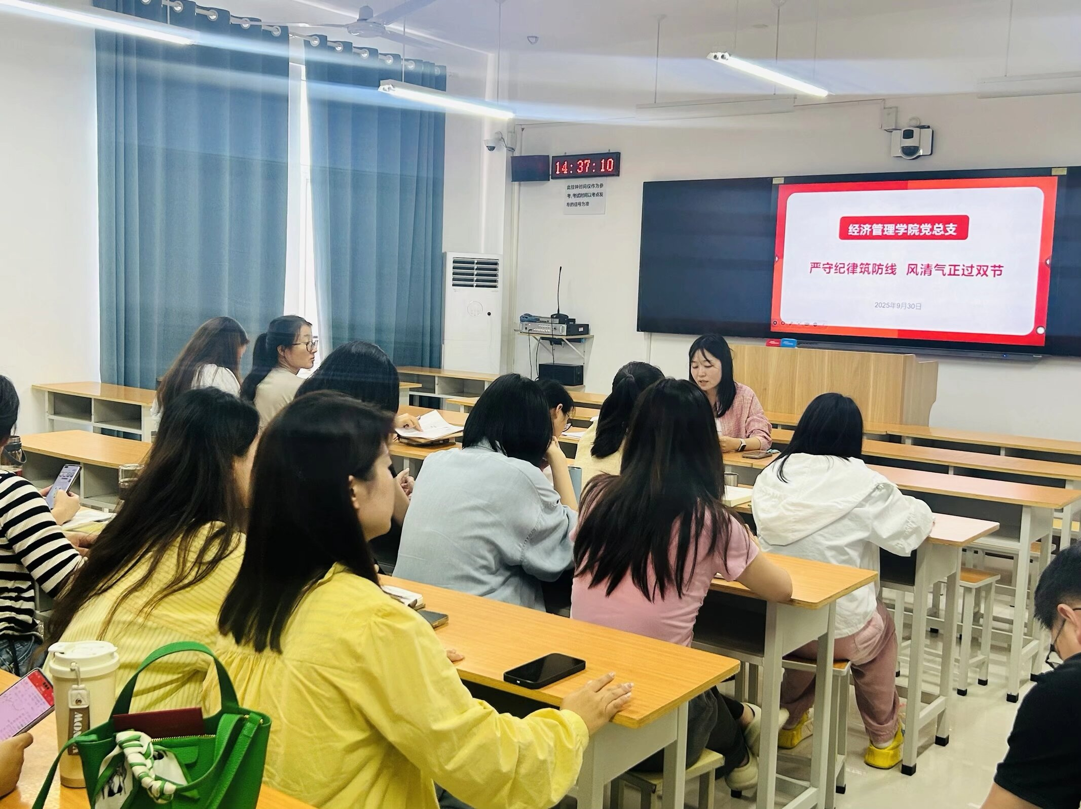 随后,会议就国庆假期师生人身安全作出要求。针对学生安全管理,聂蕴要求各岗位实习指导老师都要通过主题班会、班级群通知等各种形式,开展交通安全、消防安全、防诈骗安全宣传教育,尤其提醒外出旅游的学生提前规划行程,选择正规交通方式,避免前往人流密集或存在安全隐患的区域,同时务必保持通信畅通,定期报备行程与安全状况。