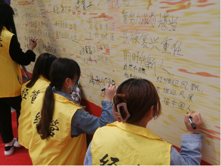 2021年也是实施“十四五”规划、开启全面建设社会主义现代化国家新征程的第一年。站在“两个一百年”奋斗目标的历史交汇点上,2021年4月22日下午,在校团委的组织下,经管学子齐聚篮球场,将发自内心的憧憬与期望献给党。
