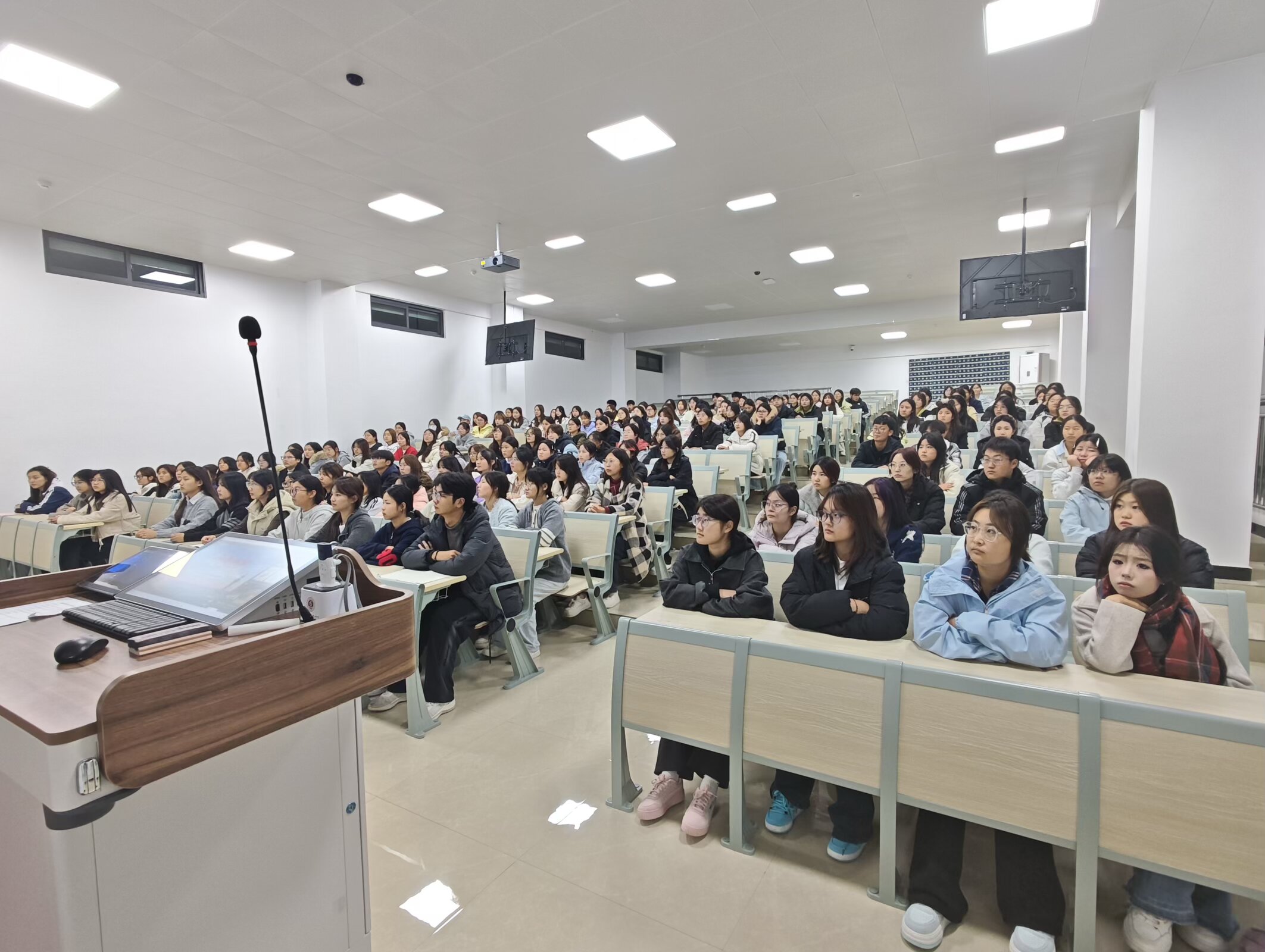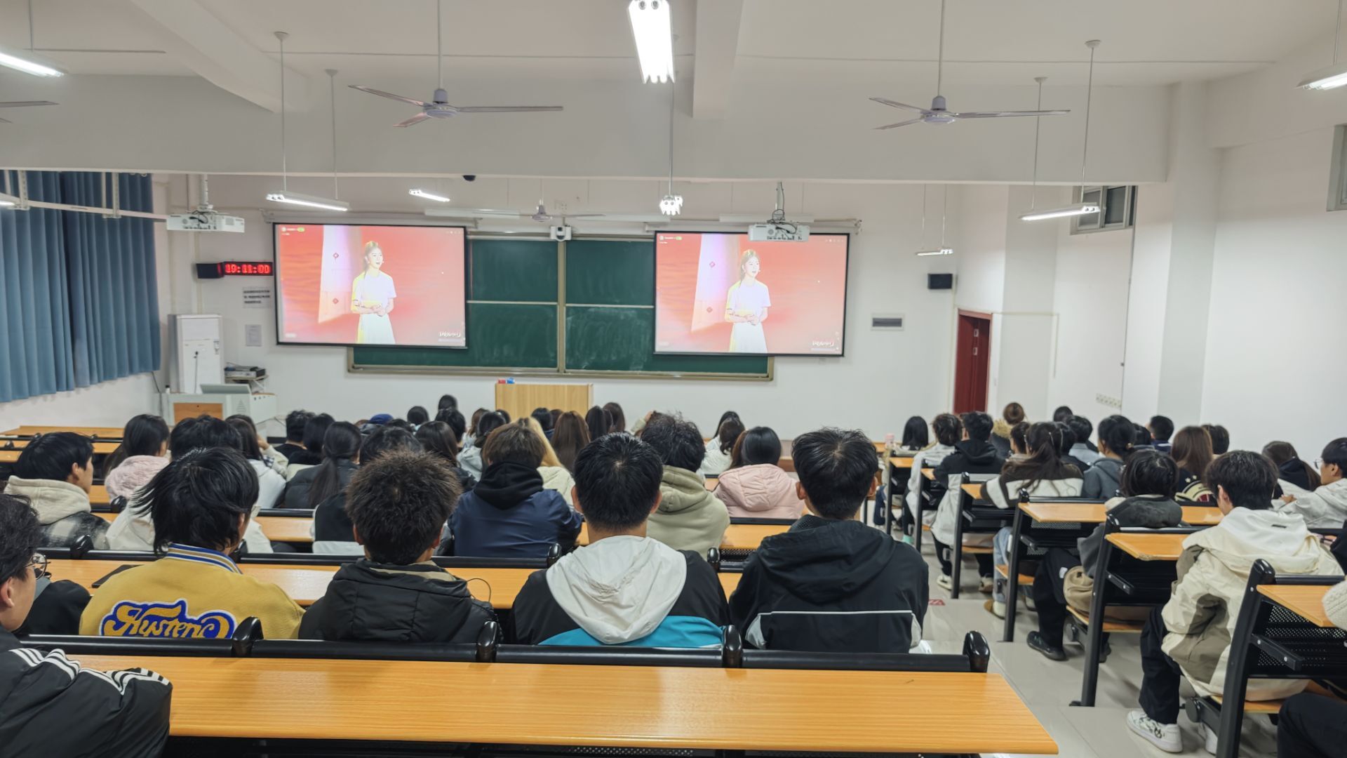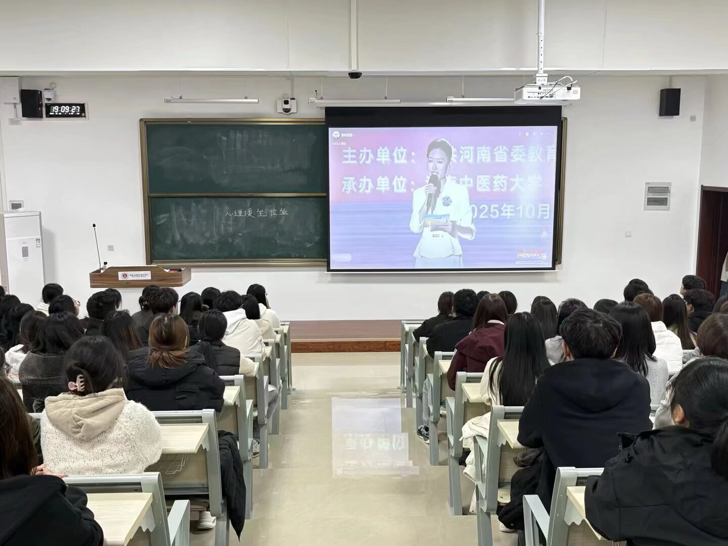在集中观看现场,师生们全神贯注,被舞台上生动演绎的剧情深深吸引。展演剧目将大学生在学业压力、人际交往、自我成长、情感困惑中遇到的真实“心事”艺术化地搬上舞台,通过戏剧冲突与情感共鸣,深刻揭示了当代青年学生的内心世界与成长课题。一幕幕贴近校园生活的场景,一个个触动心灵的瞬间,不仅让同学们看到了自己的影子,更在艺术的沉浸中感受到了理解、接纳与鼓舞,实现了心灵的自我疗愈与成长赋能。